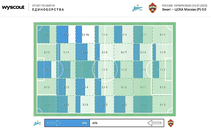 Это был основной способ доставки мяча на чужую половину. Такие забросы «Зенит» использовал только на левом фланге и они не приносили никакого результата. Виллиан Роша, против которого оказывались Кассьерра и Малком, выиграл почти всю борьбу. По карте единоборств видно, что центральные защитники ЦСКА спокойно справлялись с забросами на нападающих «Зенита». Можно сказать, что оборонительный план Федотова сработал отлично.