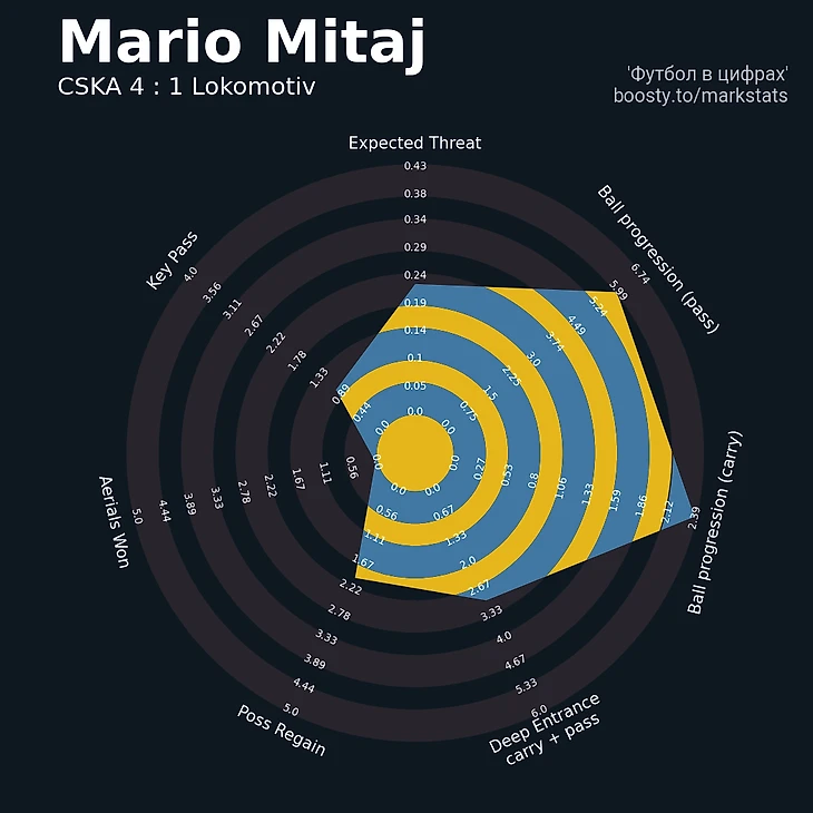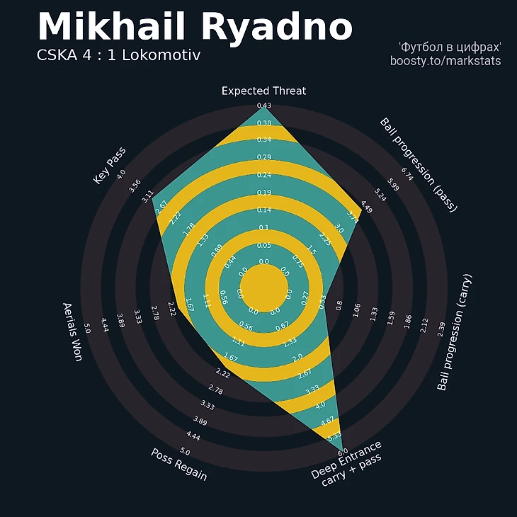 Во втором тайме ЦСКА чаще стал проходить прессинг соперника через короткие передачи. Основным направлением был левый фланг. Вышедший вместо Зайнутдинова на 35 минуте Михаил Рядно был очень хорош в продвижении. Смелые решения на мяче и высокие подключения привели к статусу лучшего игрока по ожидаемой угрозе передач (Expected Threat) и доставке мяча в зону 20 метров до ворот соперника (Deep Entrance).