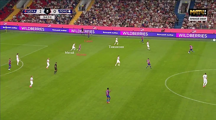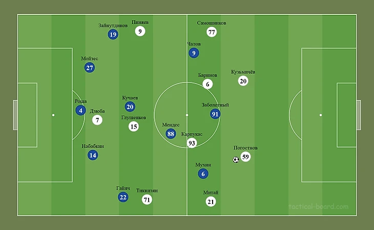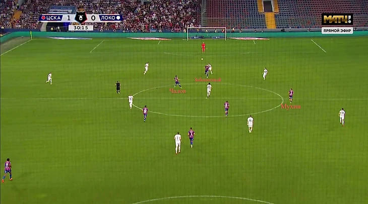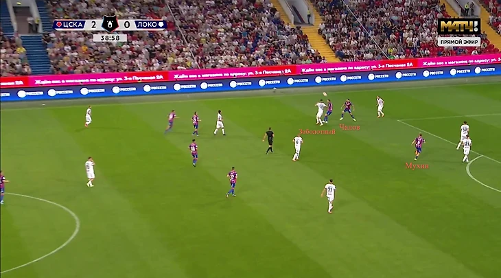 При владении «Локомотив» играл слишком стерильно – во время розыгрыша часто 6 человек оказывались за линией мяча. Такая схема позволяла хорошо контролировать, но не обострять. У ЦСКА только 3 игрока первой линии выдвигались в прессинг и иногда Мендес поднимался к одному из опорников.
