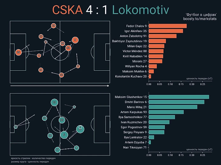 После третьего пропущенного гола Галактионов использовал сразу все 5 замен, но никак не поменял игру команды. Не было никаких новых идей и добиться чего-то в атаке «Локомотив» мог только благодаря индивидуальным действиям свежих игроков. Но против компактной обороны ЦСКА ничего создать так и не удалось. Отсутствие тактической гибкости показало, что Федотов был намного лучше готов к матчу. Можно сказать, что добиться результата удалось благодаря длинным передачам Акинфеева – показательно, что Игорь стал третьим в команде по ценности передач (тут учтены только игроки стартового состава, поэтому нет Рядно).