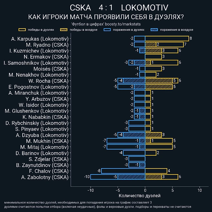 На матч против «Локомотива» ЦСКА вышел в привычном составе: схема 5-2-3 и минимум ротации. Единственное изменение было связано с возвращением Виллиана Роши. Бразилец восстановился после травмы и это было очень кстати – впереди у «Локо» играл Дзюба и именно Роша чаще всего оказывался оппонентом Артёма в единоборствах. Защитник ЦСКА смог нейтрализовать Дзюбу, который в итоге выиграл только 3 верховые дуэли из 7.