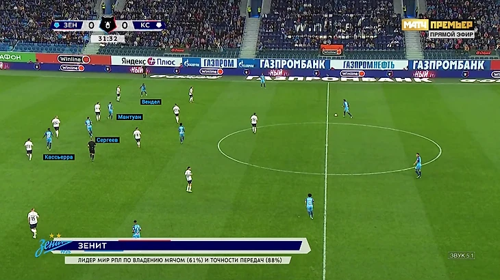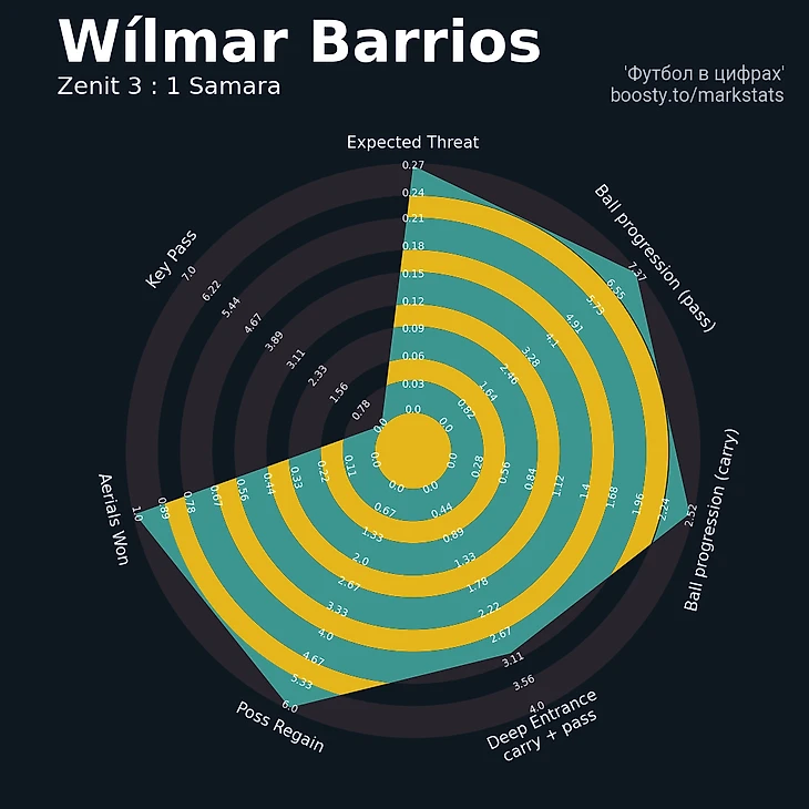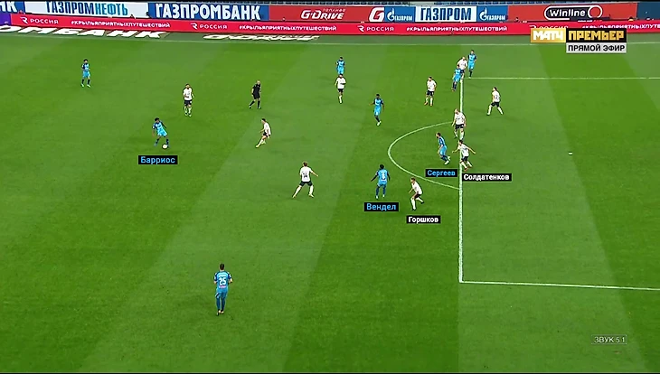 В такой ситуации Барриос снова стал главным исполнителем забросов из глубины. Я уже несколько раз отмечал, насколько опорник прибавил в этом компоненте. Его качества на мяче до сих пор остаются недооценены. В этом матче колумбиец выдал очередной перфоманс и стал лучшим почти по всем показателям, связанным с продвижением мяча. Эти баллы он не набивал количеством передач вперёд, ведь в штрафную «Зенит» заходил тоже через него. Возвратов мяча у Вильмара тоже больше, чем у остальных.