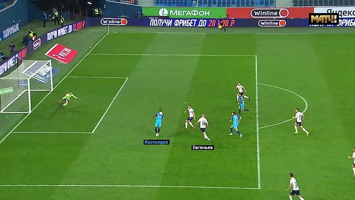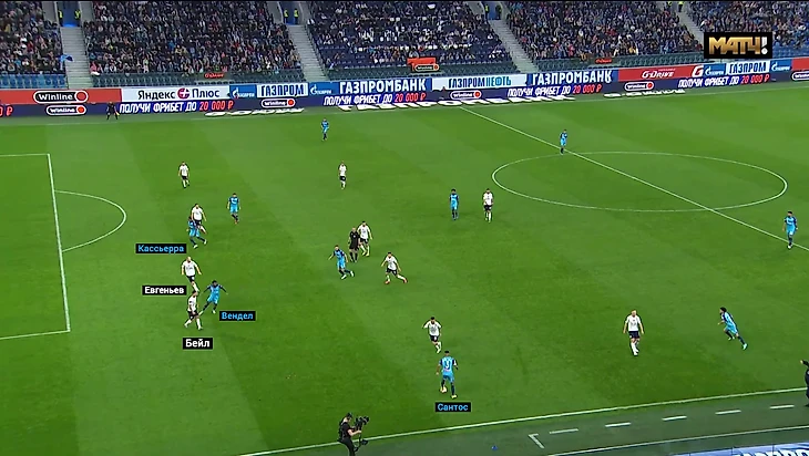 А тут Вендел сковывает Бейла и Евгеньева, Сантос быстро находит передачей Кассьерру.