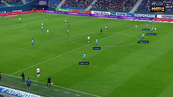 Благодаря такой схеме «Зенит» был готов к быстрым переводам на левый фланг и «Крыльям» не удавалось создавать численное преимущество.