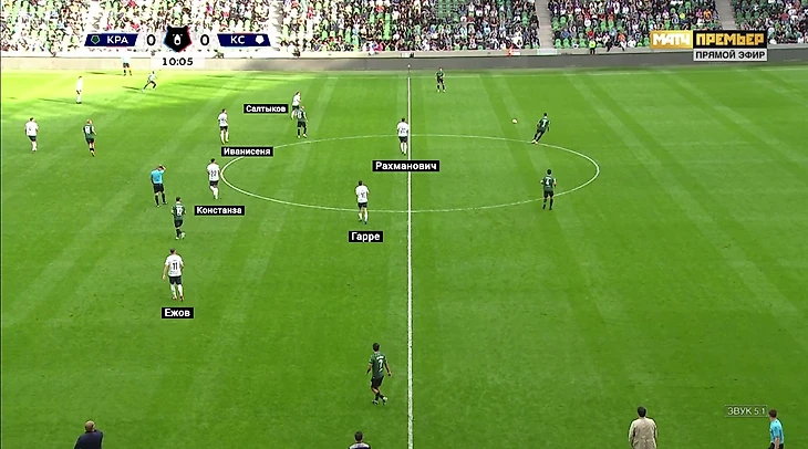 Такое решение в первую очередь связано с адаптацией под Салтыкова. Уже не первый раз мы видим, как в матче против «Крыльев» тренер использует более оборонительный вариант на правом фланге (Семак и Эракович).