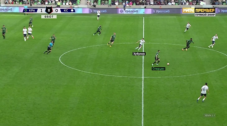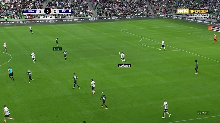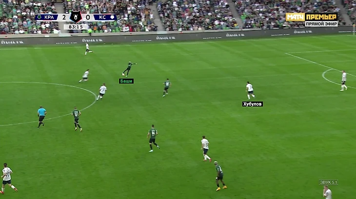В атаке один из крайних защитников «Краснодара» всегда располагался высоко, а второй оказывался ближе к паре ЦЗ. В этом матче более активным стал левый фланг. Оласа создавал ширину впереди, а Петров оставался на своей половине поля.