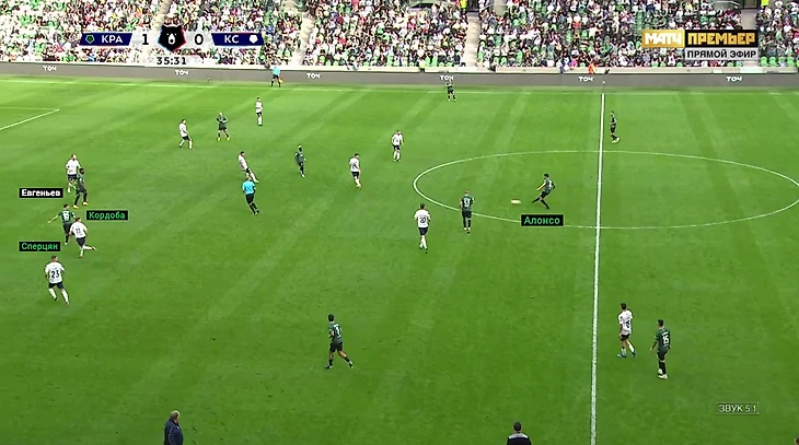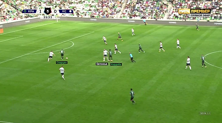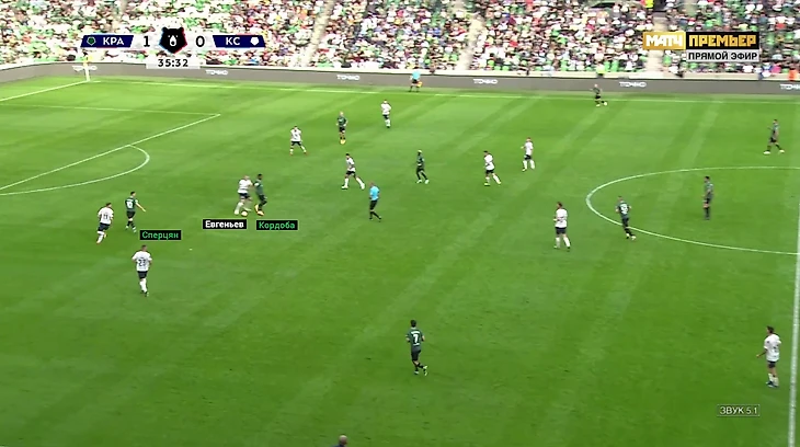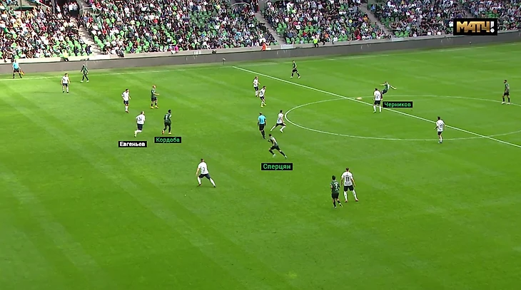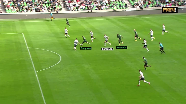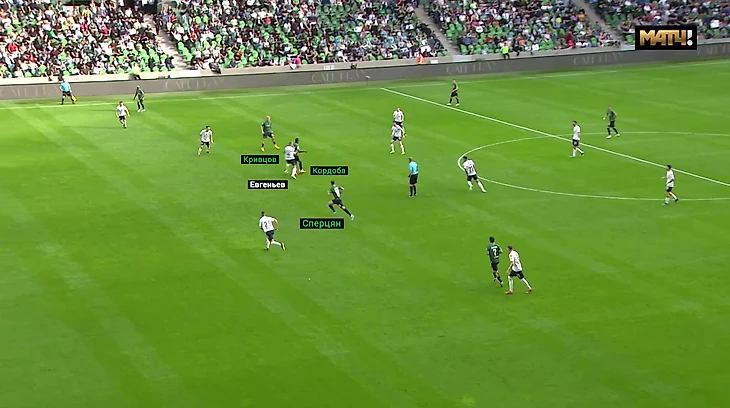 В похожей манере Кривцов действовал против Солдатенкова, дополнительно нагружая последнюю линию. Но к таким смещениям полузащитника все уже привыкли, а вот движение Кордобы было более эффективным.