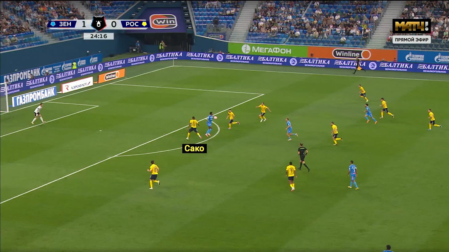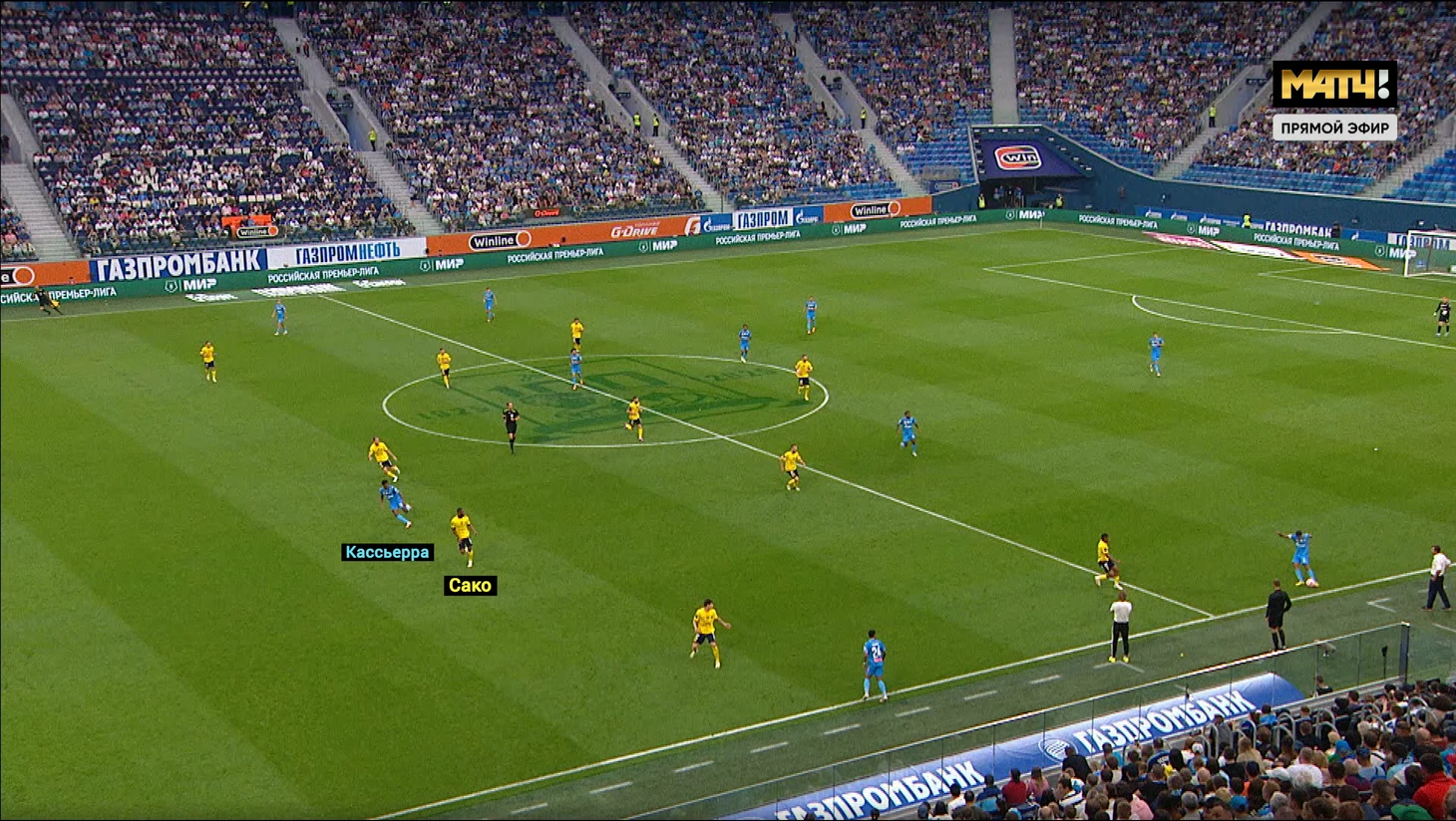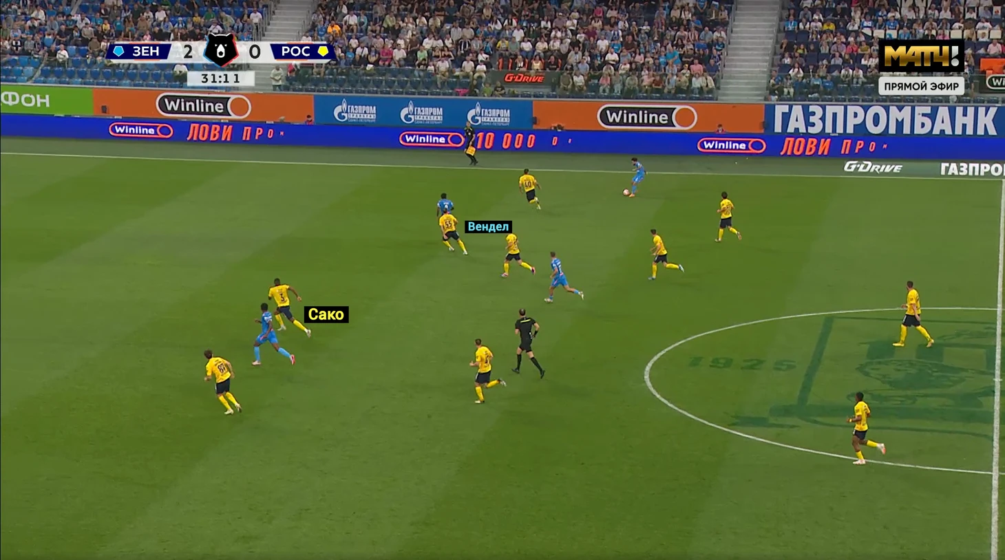После первых же матчей нового сезона было видно, главное летнее изменение от Семака – низко обороняющиеся фланги. В этот раз проявилось ярче всего: Глушенков и Педро регулярно отрабатывали за Ваханией с Ланговичем и оказывались в низких позициях. Такой «Зенит» стал ещё надёжнее в оборонительном режиме.