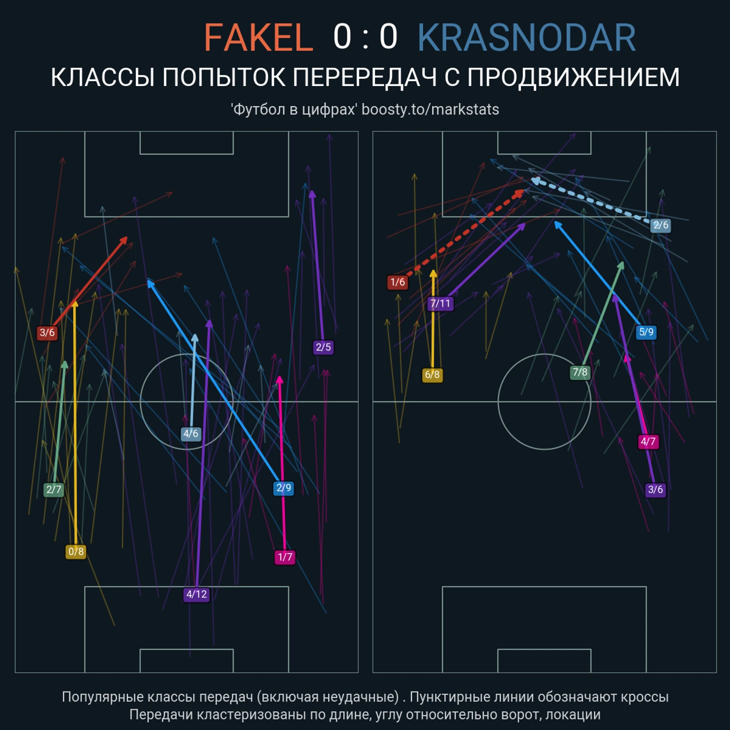 Но тут было одно явное отличие – «Факел» оборонялся строго на своей половине и дополнительная шестёрка при розыгрышах была не нужна. «Краснодар» тупо потерял одного игрока впереди. По примеру «Акрона» делали много передач в штрафную из глубоких позиций на флангах, но опасности не было.