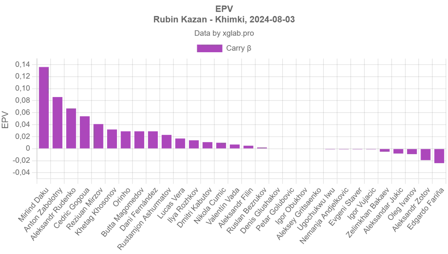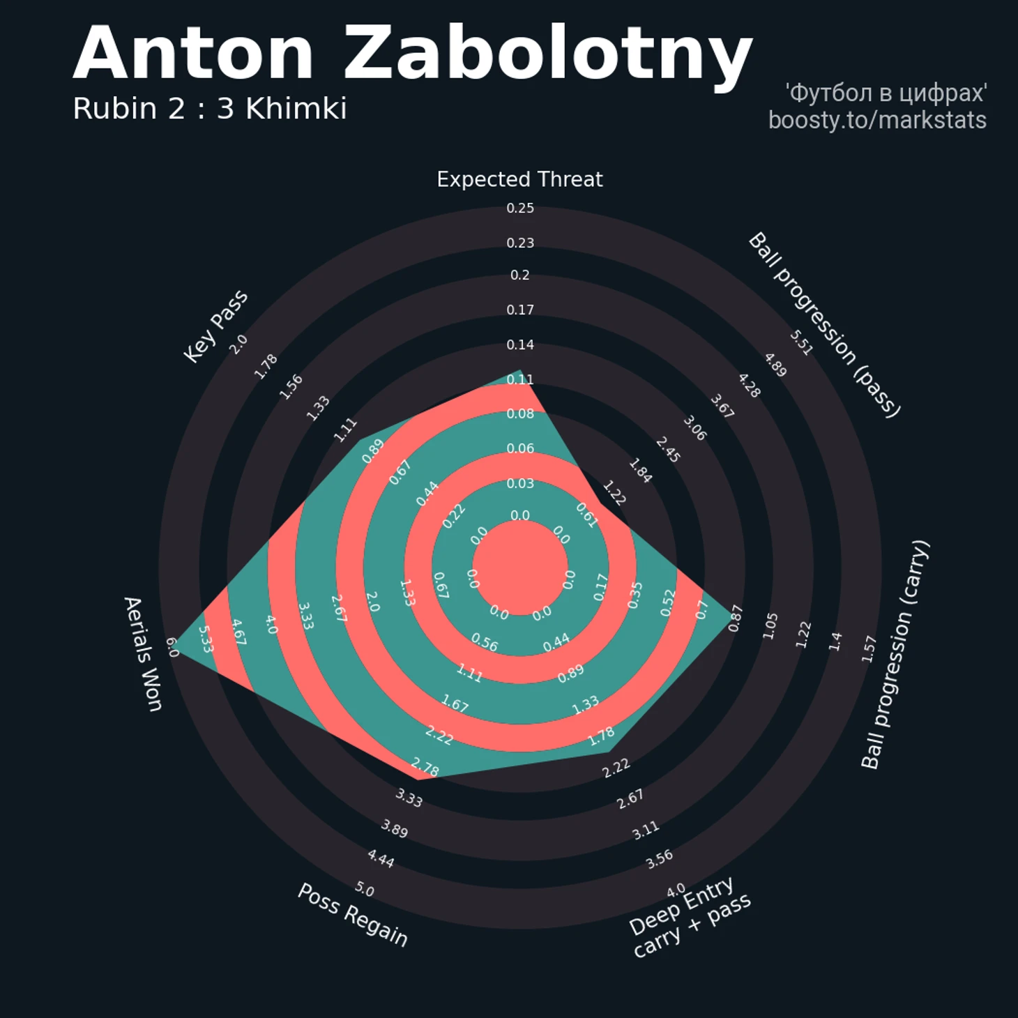 «Химки» продолжали проходить прессинг через Заболотного. Антон был привычно хорош наверху (6 выигранных верховых дуэлей), активен впереди - 4 удара, 9 передач на чужой трети, в том числе 1 ассист, и много работал без мяча – 3 возврата (больше только у Иву).