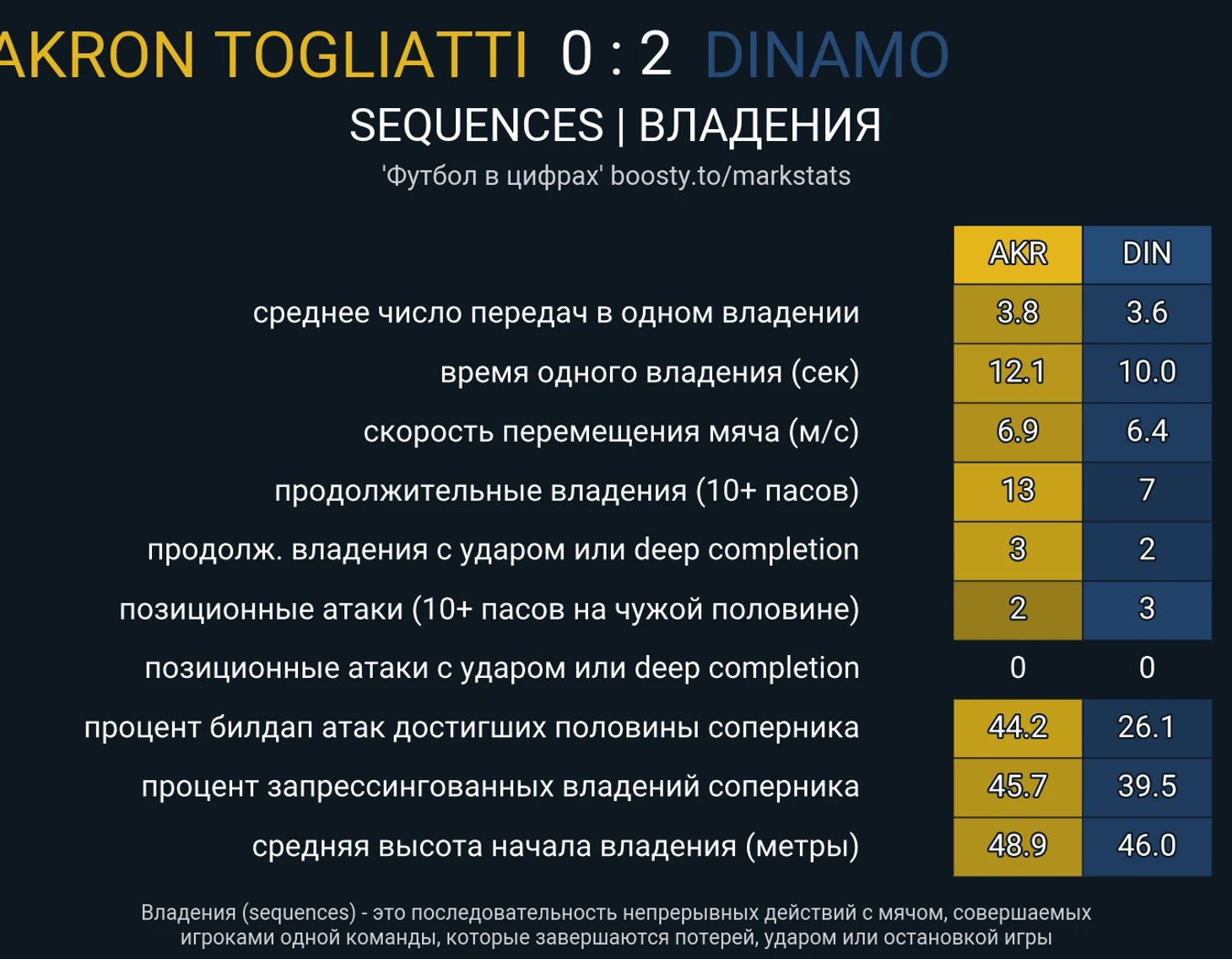 В таком режиме порадовал и «Акрон». При розыгрышах от ворот команда полностью отказывается от выносов – только короткий и средний пас. Нетипично для новичка, но на получается на удивление эффективно. В этой игре 44.2% билдап атак достигли половины поля «Динамо».