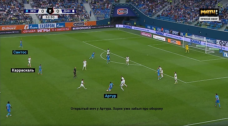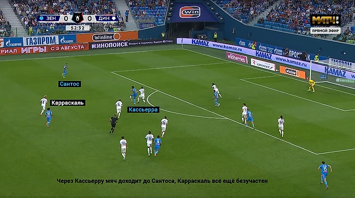 Замена Гладышева на Карраскаля в перерыве стала ключевым событием. Да, Ярослав индивидуально не дотягивает до уровня основных креативных игроков: Бителло, Нгамалё и Хорхе. Но желание Лички усилить правый фланг сразу обернулось провалами в обороне. Колумбиец почти не бежал назад с первых минут тайма, один раз оставил в одиночестве Сантоса прямо у штрафной. а в голевой атаке бросил Педро и не побежал за ним.