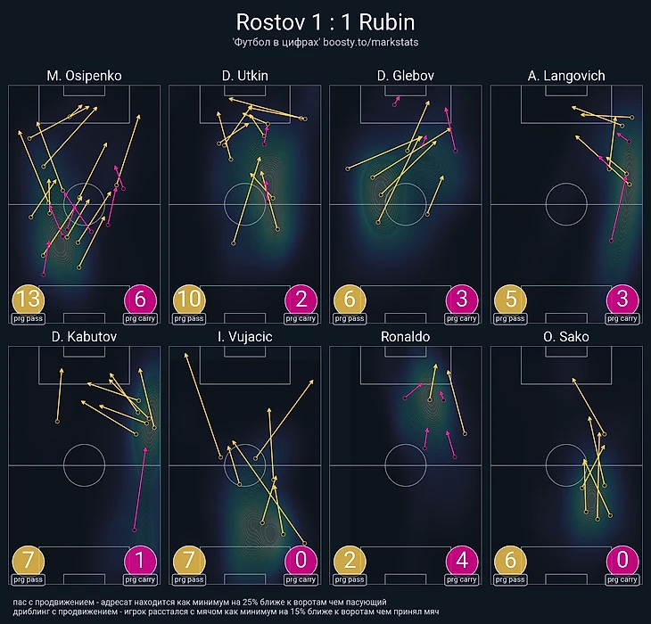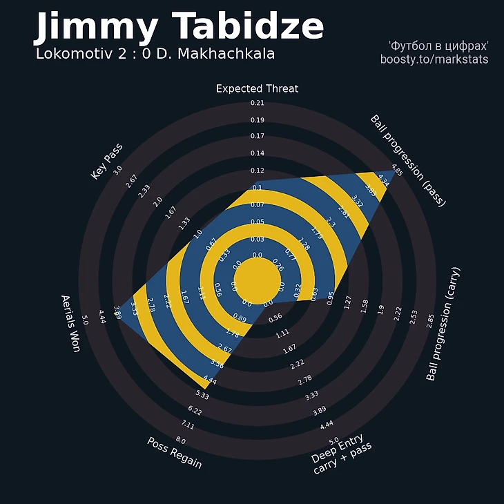 Чувствовалось, что «Динамо» почти приговорило себя после быстрого гола. Даже в атаке приятно запомнился только один защитник (Касинтура не в счёт) – Джемал Табидзе. Нанёс 3 удара после угловых на 0.26 xG суммарно, но тут скорее вопросы к обороне «Локо». В обороне грузин тоже был неплох – единоборства и возвраты значительно выше среднего и 5 передач с продвижением вдобавок. Правда, Морозов во время результативного углового выиграл борьбу как раз у Джемала.