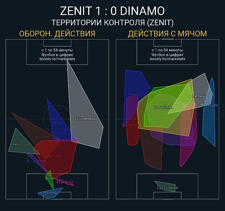 «Зенит» начал матч привычно осторожно и снова часто оказывался в позиционной обороне. Низкие фланги – всё ещё главное обновление от Семака. Удивляет, что в эту систему вписывается и Глушенков. В этот раз успевал опускаться до своей штрафной и всё ещё был максимально полезен в атаке. Глядя на эту карту оборонительных действий даже у Карпина не останется сомнений по вызову в Сборную.