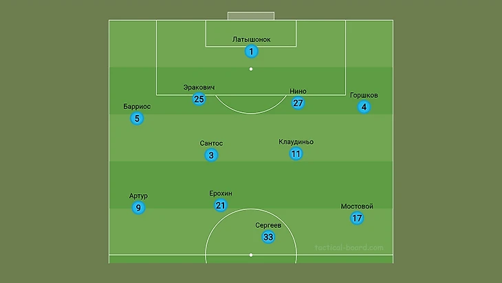 После этого «Зенит» перестроился радикально – Сергеев и Ерохин вперёд, Сантос в центр вместо Горшкова, а Барриос на правый фланг обороны.