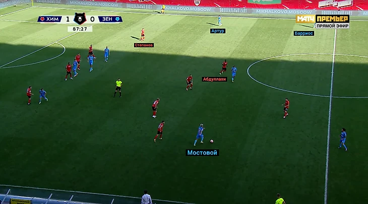 Полузащитник не успевал смещаться на фланг и Степанов оставался один слева. За 6 минут «Зенит» сделал 4 подачи из зоны Абдуллахи. Предголевой пас Артура и момент Ерохина в самом конце в том числе.