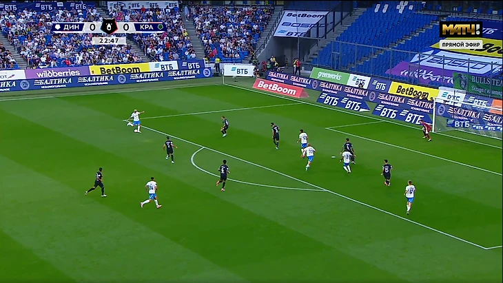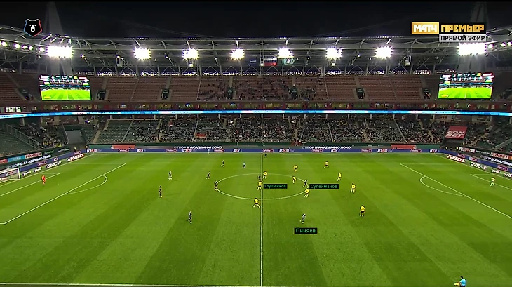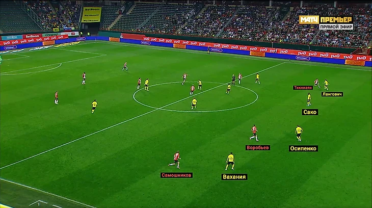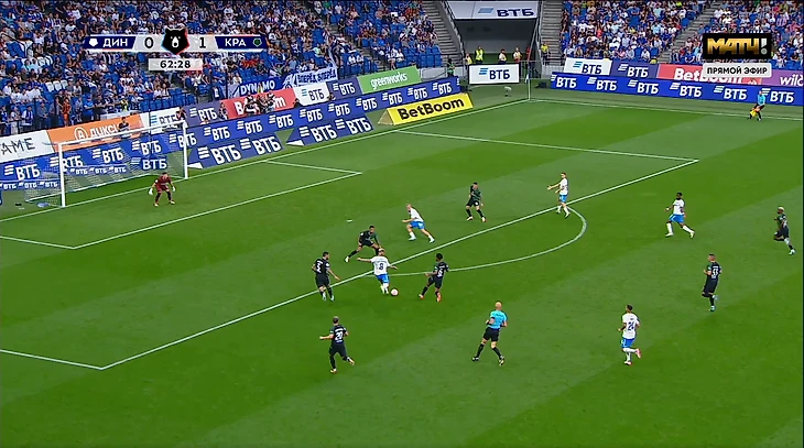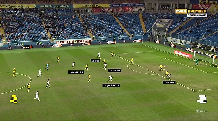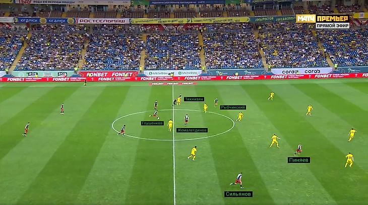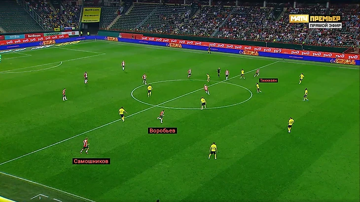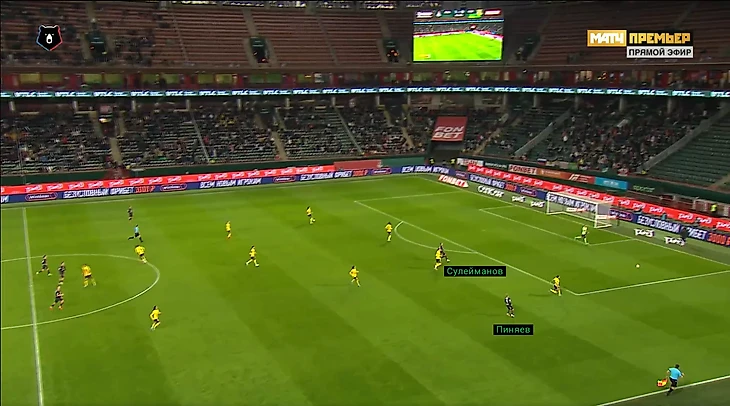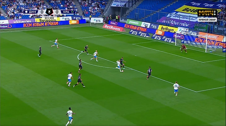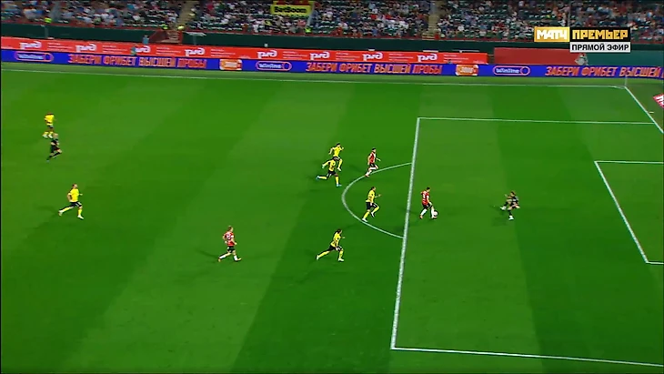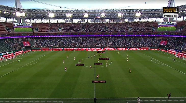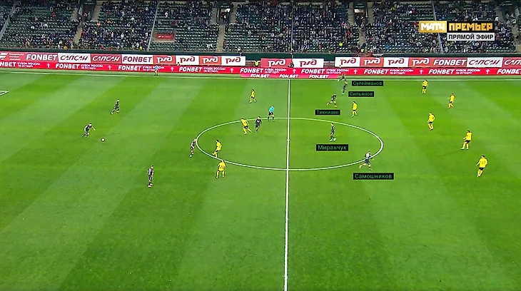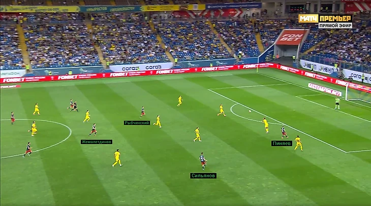 Батраков отдаёт на Карпукаса и сразу 3 игрока делают рывок вперёд.