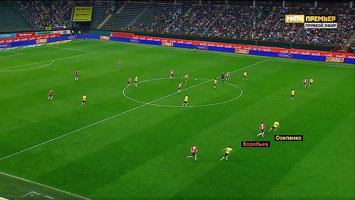 В итоге мяч уже пересёк центр поля, а Осипенко только затормозил. И даже в этот момент защитник «Ростова» ближе к своим воротам, чем Воробьёв.