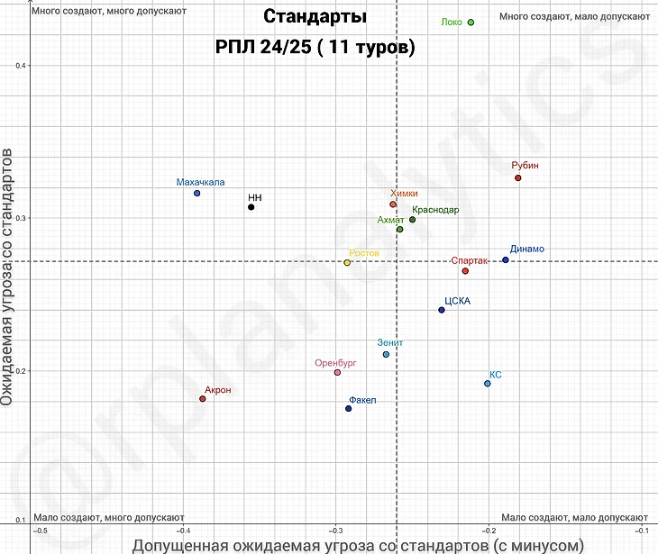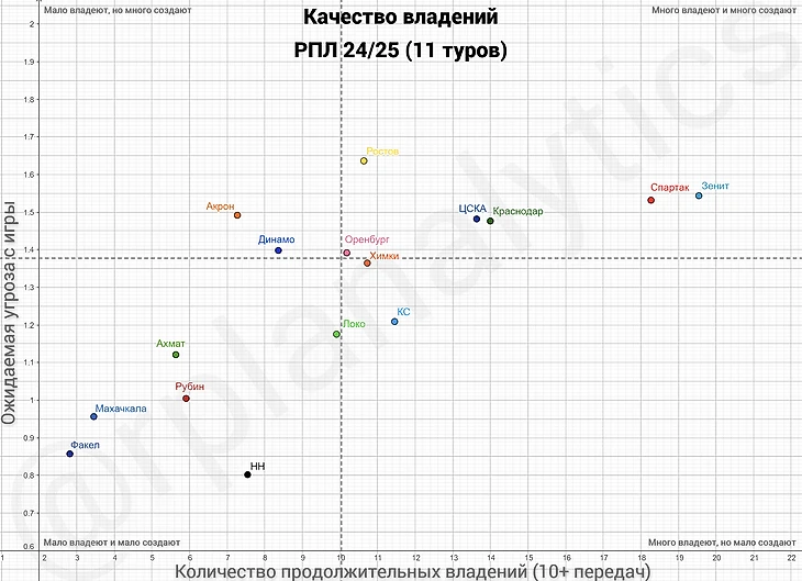 В прошлую международную паузу я разбирал прошедший отрезок РПЛ (на тот момент 7 туров) и анализировал игру каждой команды. Сейчас я сделал то же самое – обновил данные и снова оценил стилистические особенности и качество основных аспектов игры всех 16 команд. Многие причины, по которым команда находится слишком высоко или слишком низко уже были описаны в предыдущем материале, поэтому сейчас больше внимания будет уделено динамике. Для этого везде будут прикреплены старые графики (7 туров) и обновленные (11 туров).