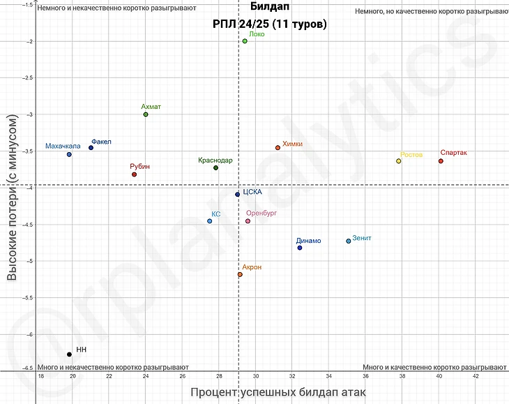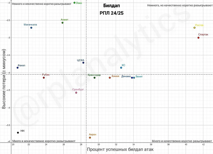 «Акрон» удивляет прогрессом. Тут тоже отразился приход Дзюбы – теперь Тедеев намного чаще использует длинный пас, предотвращая потери в опасных зонах. Да, по проценту успешных билдап атак «Акрон» не стал лучше, но сохранил тот же уровень и при этом стал надежнее.