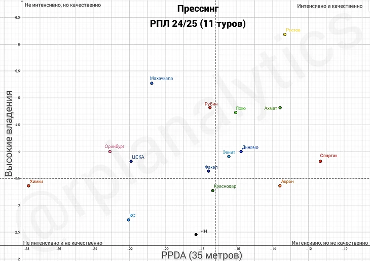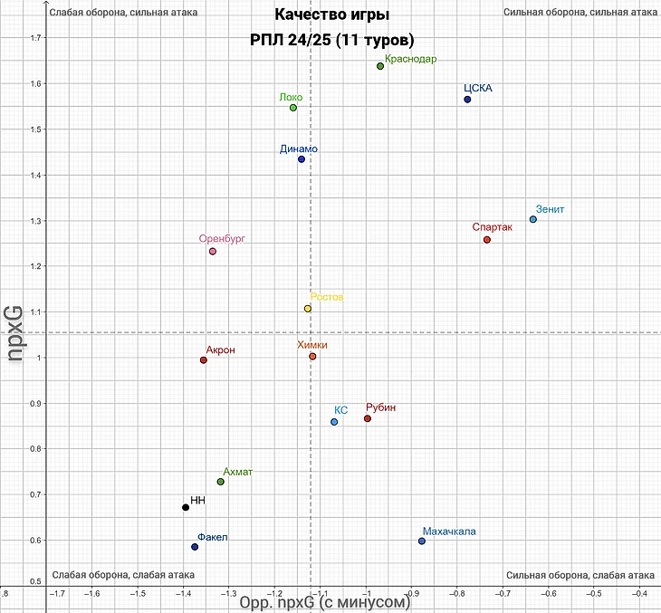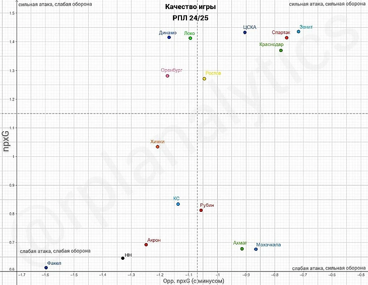 «Ахмат» и «Махачкала» ожидаемо регрессировали к среднему по своим причинам (Ташуев намного смелее Адиева), а «Пари НН» на дне увеличил отрыв от остальных: Илич в последних матчах пытался строить розыгрыши без выносов на чужую половину, но получалось ужасно.