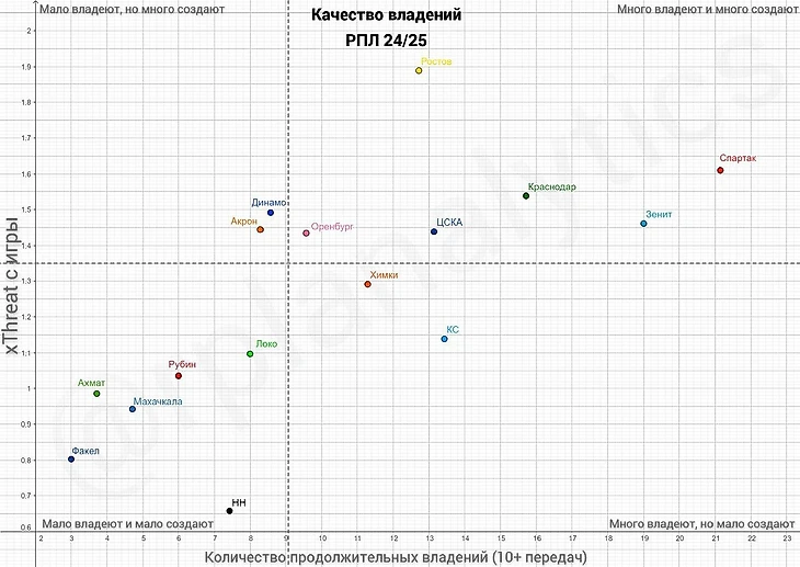 Разбирать атакующую игру команд начнем с позиционных атак. Будем соотносить число продолжительных владений (10+ пасов) в среднем за игру и ожидаемую остроту, которую команда создает с игры. Для этого используется модель Expected Threat, которая оценивает изменение вероятности забитого гола в течение нескольких следующих действий. Поэтому атаки, которые не завершились ударом, тоже входят в оценку ожидаемой угрозы.