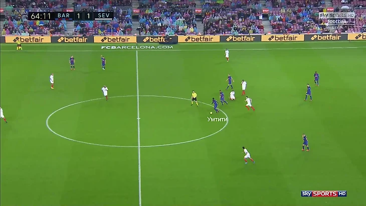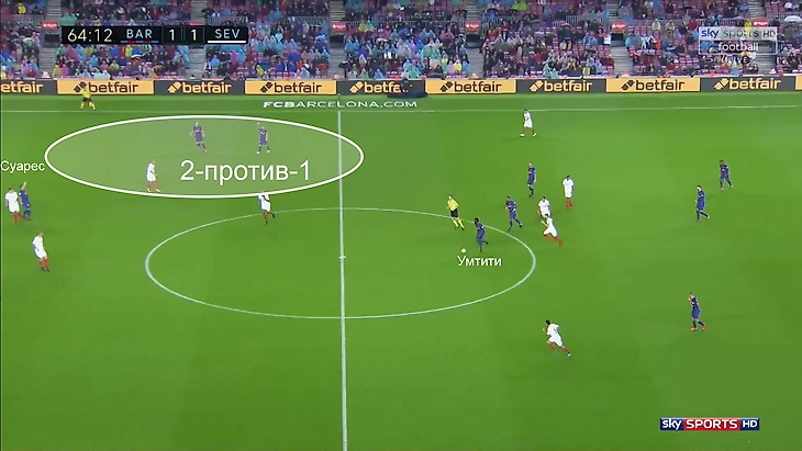 Но он замечает подсказку Суареса, который заметил в ситуацию 2-против-1 на правом фланге. Умтити принимает нестандартное и ключевое для эпизода решения.