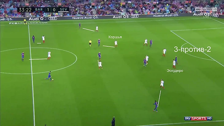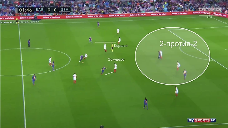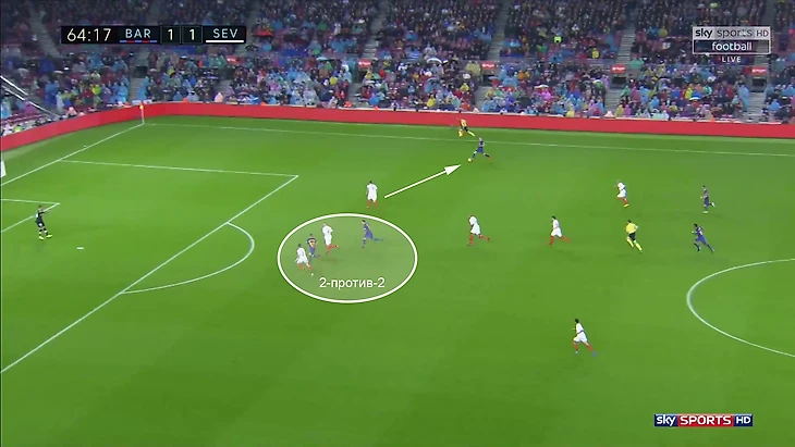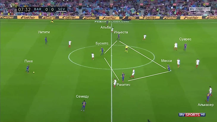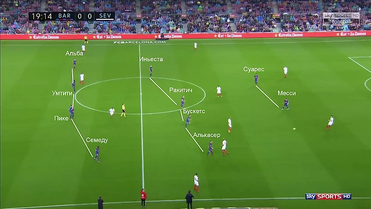 В первые 25 минут «Барса» доминировала в центре поле. «Севилья» играла персонально, но у них было на игрока меньше. Чтобы это компенсировать, в центр поля выдвигался один из крайних защитников (при ошибках оба сразу). Но даже с этим – благодаря классу – «Барса» справлялась, а «Севилья» получала ситуации 2-в-2, где против двух центральных защитников Суарес и Алькасер.