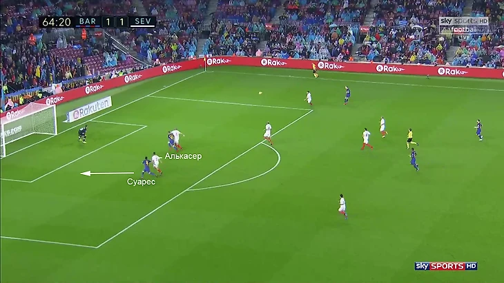 Крутая работа Суареса не закончилась. Благодаря его подсказке, один из защитников выдвинулся на фланг. Теперь он и Алькасер в ситуации 2-в-2.