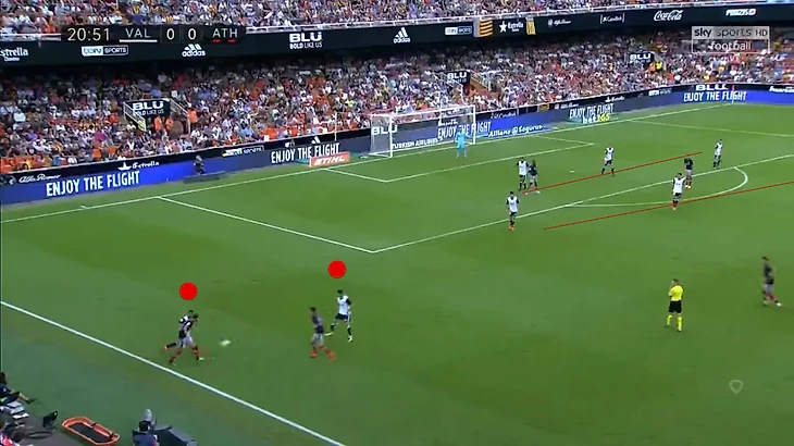 На примерах выше тройка полузащитников всегда перекрывает центр вместо того, чтобы поддерживать игроков на флангах (и компактность). Сопернику проще уйти от прессинга на фланге, но при возвращении мяча в центр он оказывается в явном меньшинстве. Тут «Валенсия» и отбирает мяч.