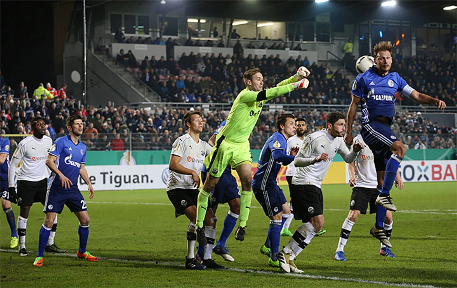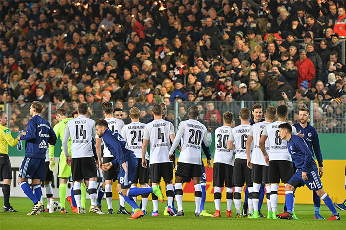 В 1/8 финала Кубка Германии «Шальке-04» достался в соперники скромный клуб второй бундеслиги «Зандхаузен» из одноименного городка с населением 14900 жителей. На городском стадионе «Хардтвальдштадион», рассчитанном на 12100 зрителей, собрались 14500 человек – то есть на стадион пришли почти все.