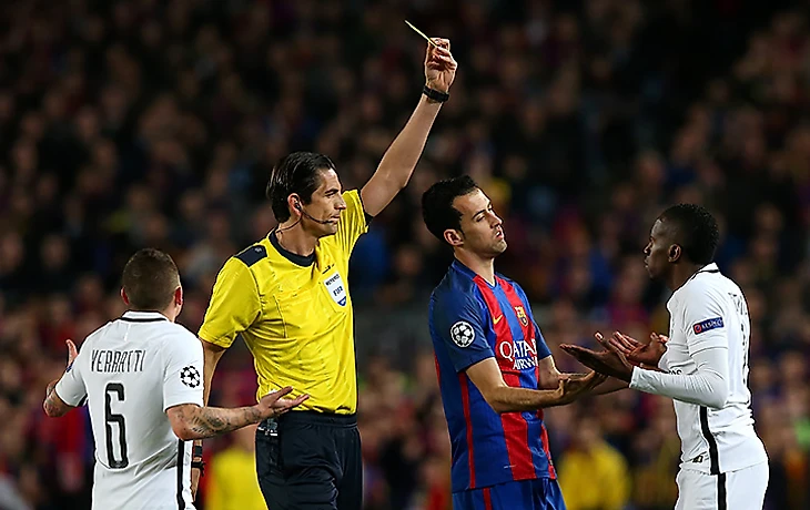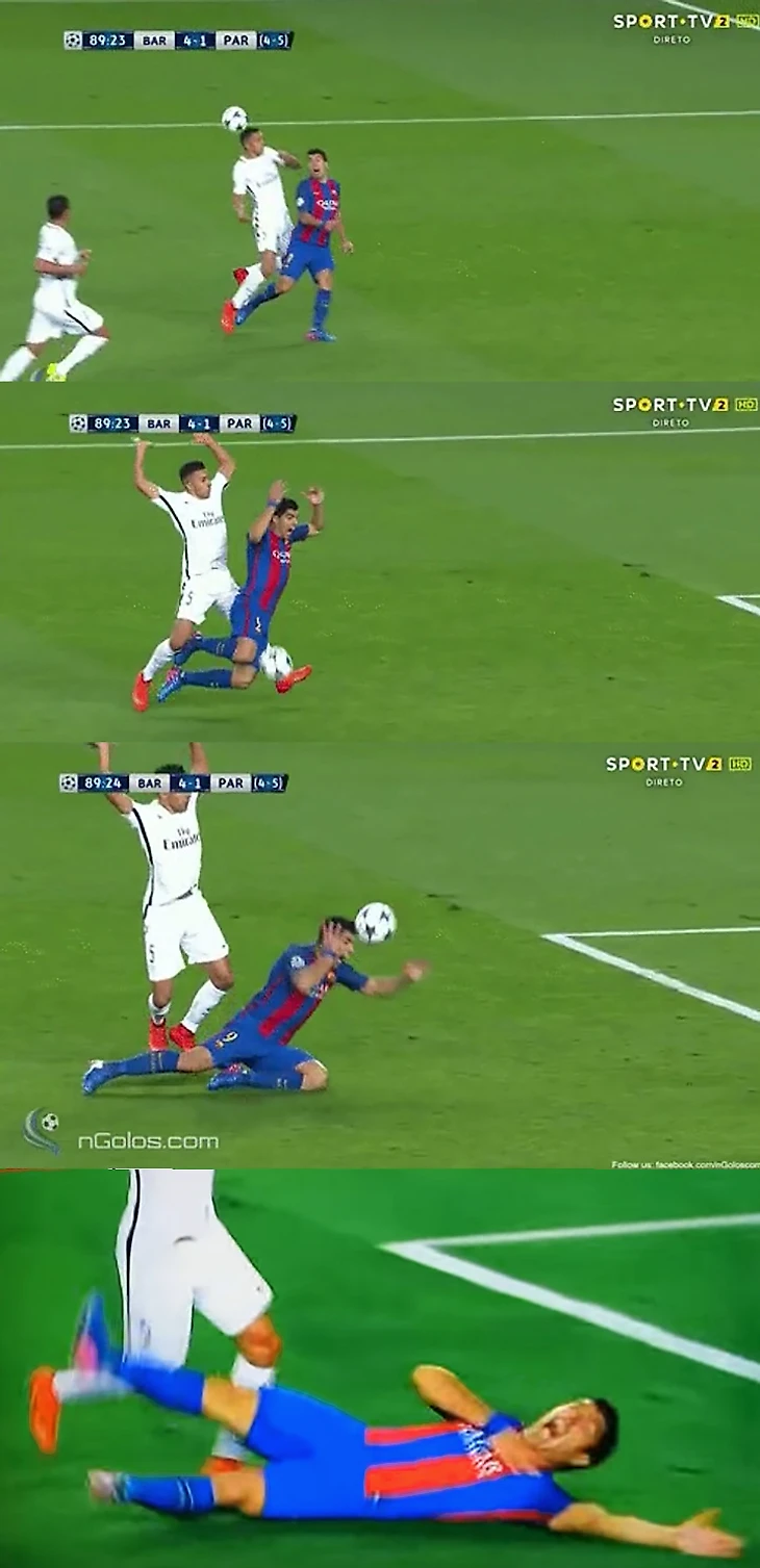 90-я минута, счет 4:1, «Барсе» все еще не хватает двух голов. Месси забрасывает мяч в штрафную на Суареса, Маркиньос касается шеи форварда, тот падает – и Айтекин решает, что это пенальти. На этот раз самостоятельно.