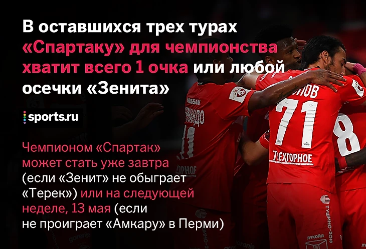 Даже если «Спартак» в 3 турах наберет только 1 очко, ему будет все равно, как сыграет «Зенит». Питерцы могут догнать «Спартак» по количеству очков (64), но по главному дополнительному показателю (количество побед) уже точно останутся позади (как минимум 20 у «Спартака», как максимум 19 – у «Зенита»).