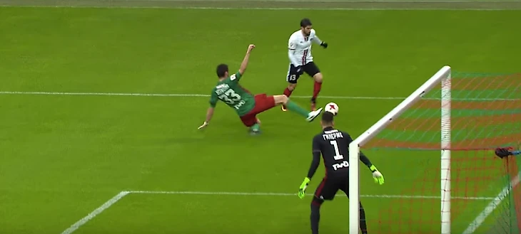 Сначала он назначил пенальти в моменте, в котором вообще не было контакта между защитником «Локо» Соломоном Кверквелией и Роландом Гиголаевым из «Амкара». Кверквелия пытался сделать подкат, но игрок «Амкара» воспользовался случаем и зрелищно упал сам.