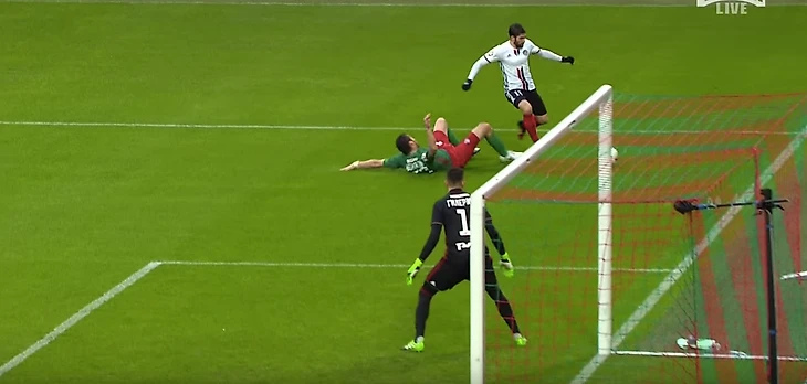 Игрок Амкара ближе вратаря к лицевой линии. В данном случае Гильерме нужно считать последним защитником, а защитника условным вратарем.
