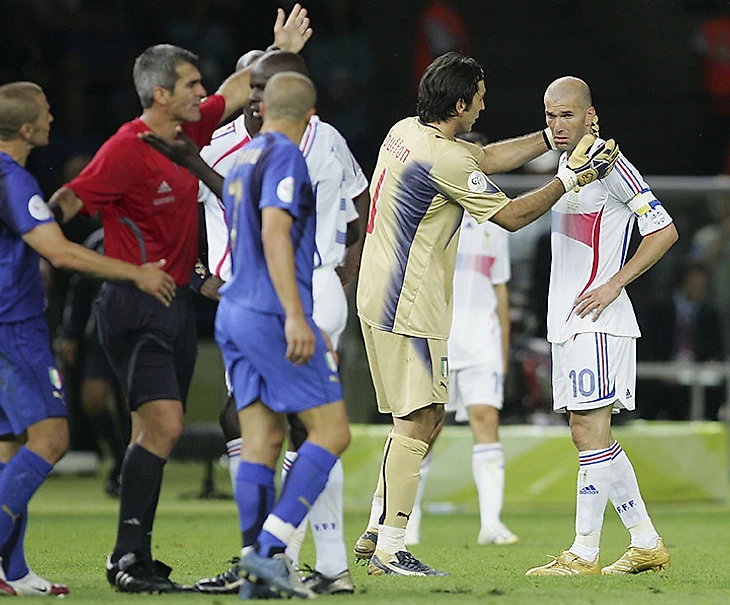 В дополнительное время Буффон прибежал успокаивать француза, когда тот боднул Матерацци и получил красную.