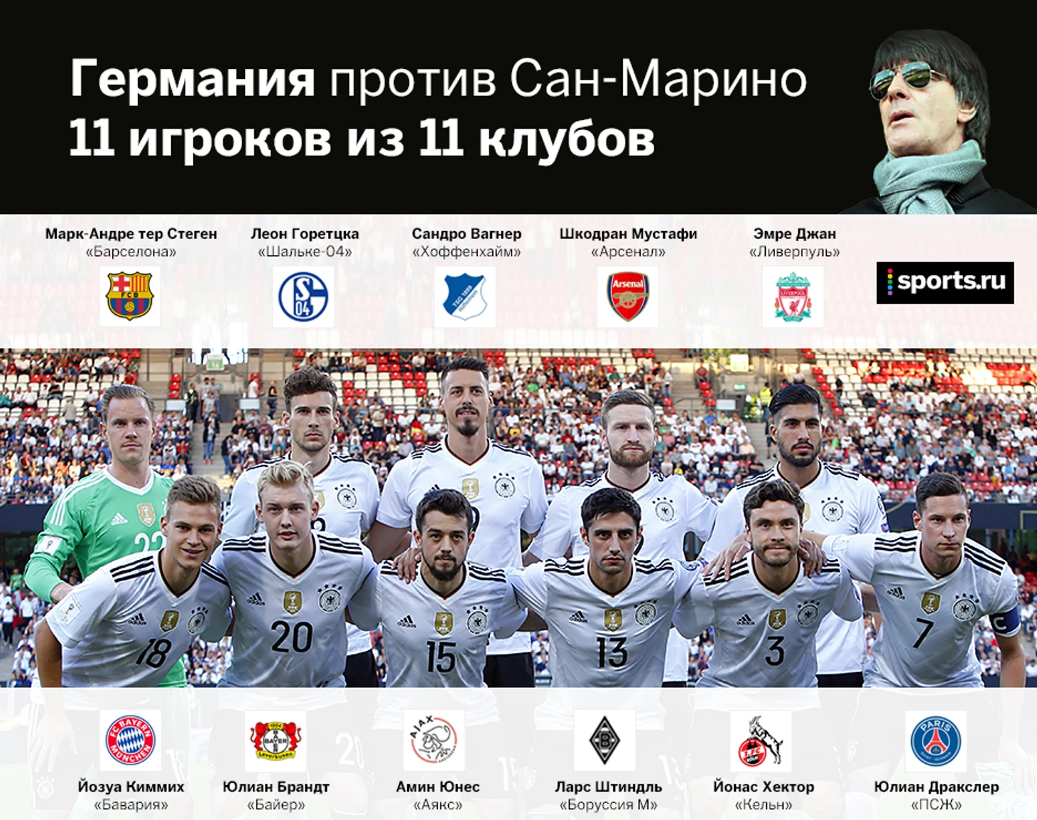 Главный тренер сборной Германии Йоахим Лев решил сделать отборочные матчи хотя бы чуть-чуть веселее и на игру с Сан-Марино выставил 11 игроков из 11 разных клубов: