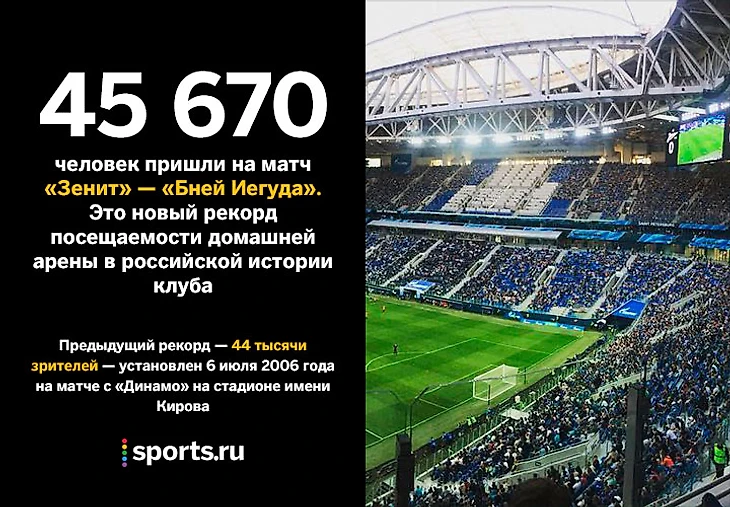 «Зенит» сегодня вышел в раунд плей-офф квалификации Лиги Европы. Несмотря на поражение 0:1 от «Бней Иегуды» из Израиля, об этой игре останется и хорошее воспоминание: на матч с не самым известным соперником пришло рекордное количество зрителей в постсоветский период – 45 670.