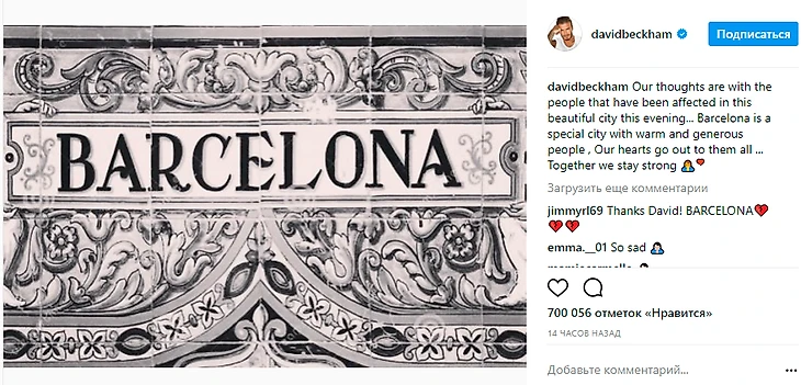 «Мысленнно мы с людьми, которые пострадали в прекрасном городе. Барселона – особый город с теплыми и щедрыми людьми. Наши сердца с вами, вместе мы сильны»