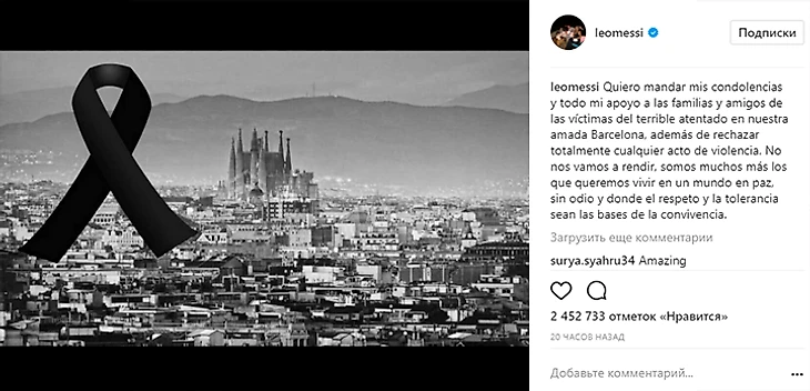 «Мои соболезнования и моя поддержка всем, кто пострадал во время страшной атаки в нашей любимой Барселоне. Я против любого насилия. Мы не собираемся сдаваться. Тех, кто хочет жить в мире, где нет ненависти, где взаимное уважение и терпимость много значат, гораздо больше»