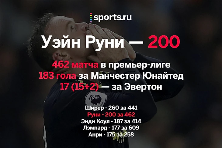 В понедельник Уэйн Руни открыл счет в матче «Ман Сити» и «Эвертона». Этот гол стал для него вторым в двух матчах АПЛ после возвращения в «Эвертон» – и 200-м в премьер-лиге вообще.