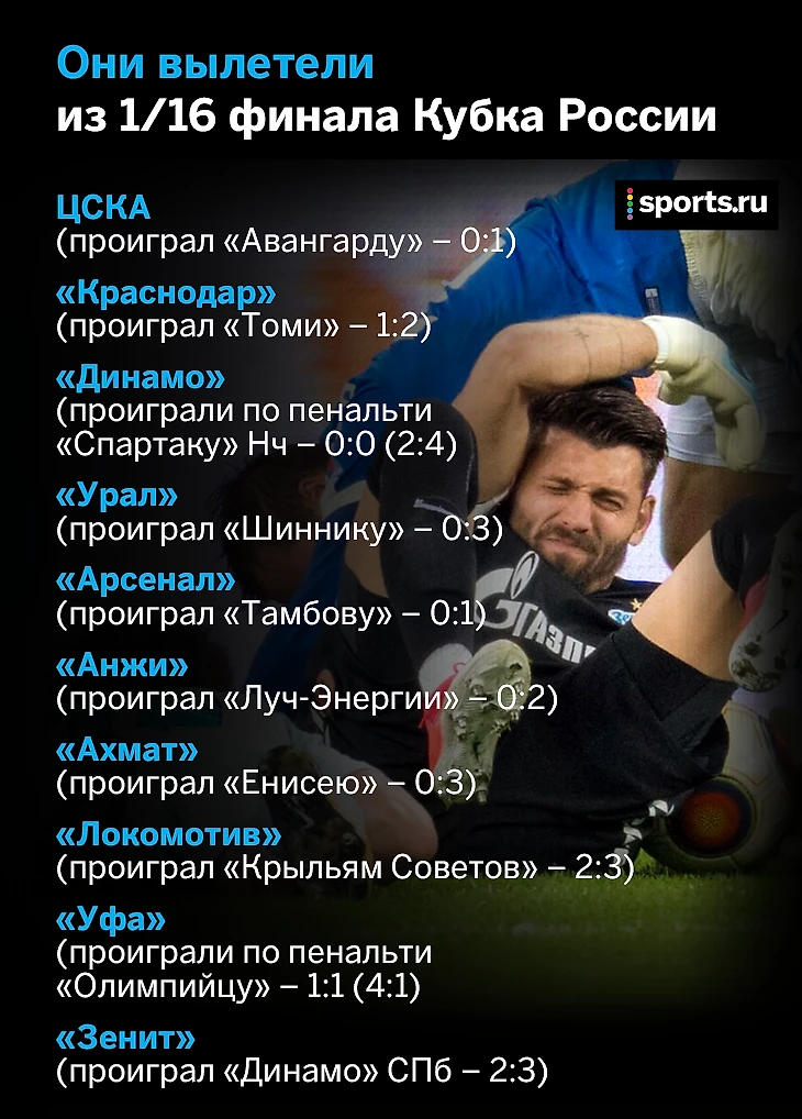 В среду в Кубке России было сыграно десять матчей с участием клубов РФПЛ. В пяти победили команды ФНЛ, а московское «Динамо» вообще вылетело от команды ПФЛ. Сегодня прошло еще шесть матчей – вылетели еще четыре команды, в том числе «Зенит».