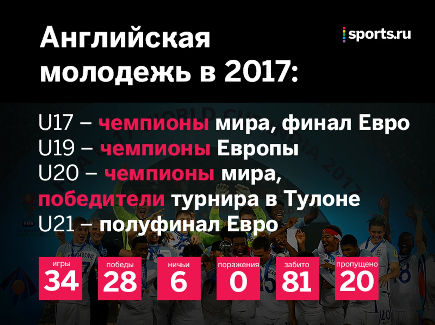 2017 год стал годом сборных Англии: победы на ЧМ U17 и U20, Евро U19, знаменитом турнире в Тулоне, а также финал Евро U17 и полуфинал Евро U21. Такой коллеции за один год англичане не собирали никогда в истории. Серьезные деньги, которые в свои академии давно вкладывают «Челси», «Манчестер Сити», «Ливерпуль» и многие другие топ-клубы, наконец, принесли видимые результаты. В каждой из сборных огромное количество талантов: у Англии все больше оснований надеяться, что 50+ лет боли скоро закончатся.
