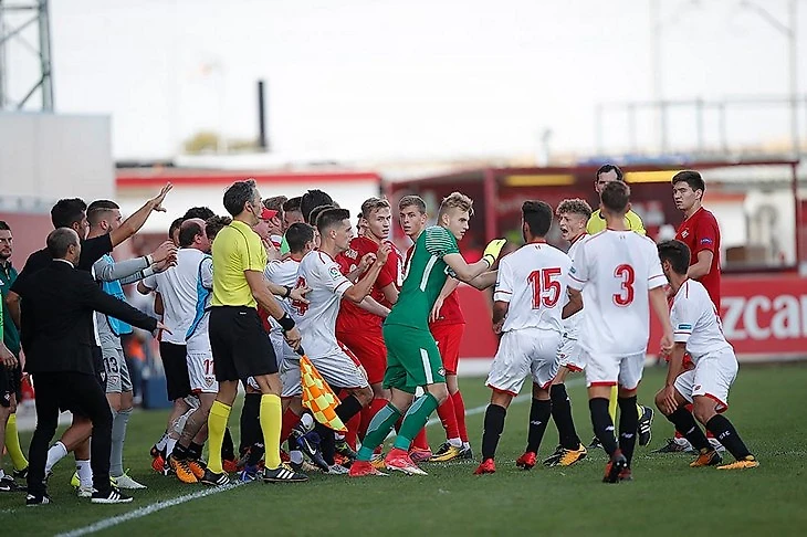 Конфликт между «Спартаком» и «Севильей» полыхал еще во время матча. На 85-й минуте это привело к драке. Игрок «Севильи» сорвал атаку, схватив спартаковца за шею, тот попытался вырваться, а испанец тут же картинно упал на землю – нервы не выдержали, около скамейки «Спартака» вспыхнула стычка.