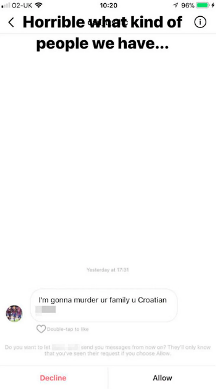 «Я убью твою семью, хорватский придурок», – написали ему в личные сообщения. Терпение защитника кончилось, и он решил рассказать об угрозах всем.