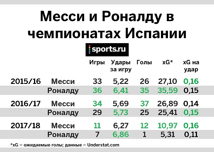 Тактические гуру Sports.ru, впрочем, наверняка давно приучили вас к тому, что статистика ударов без оценки их качества часто рисует неполную или искаженную картину. Кроме того, 7 матчей – слишком короткая дистанция, на которой слишком велико влияние случайных факторов. Потому сравним лучше чуть более продвинутую статистику Месси и Роналду и посмотрим заодно, что было в прошлых сезонах: