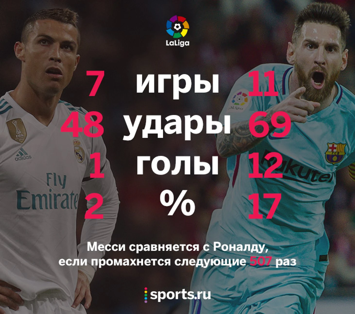 Первые 11 туров сезона испанской Ла Лиги выбили из двух главных футболистов современности неожиданную статистику. Точнее, у Месси она вполне обычная, а вот Роналду пропустил почти половину матчей и забил всего 1 гол при ужасной реализации: