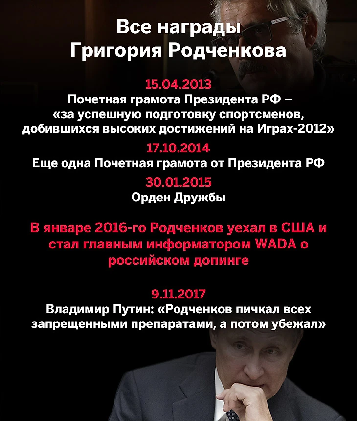 Родченков обвинений не признал, но подал в отставку. В январе 2016-го уехал в США, опасаясь за свою жизнь. Еще полгода спустя дал знаменитое интервью The New York Times, а дальше вы знаете.