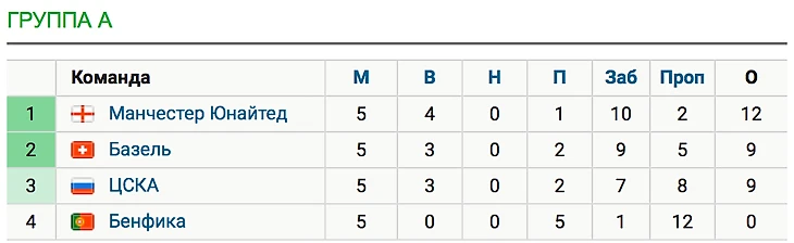 1. «Манчестер Юнайтед» – 6 очков, разница – 7:2 (в гостях – 4 мяча);2. «Базель» – 6 очков, разница – 4:5 (в гостях – 2 мяча);3. ЦСКА – 3 очка, разница – 3:7 (в гостях – 2 мяча);