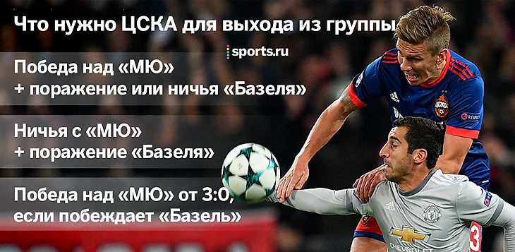 Вылет «МЮ» практически невозможен – для этого ему надо проиграть ЦСКА со счетом от 0:7. Даже поражение 0:6 гарантирует англичанам выход в плей-офф (тогда будет разница 7:8, но по голам в гостях «Базель» окажется ниже). Возможно, в этом сегодня главный шанс ЦСКА.